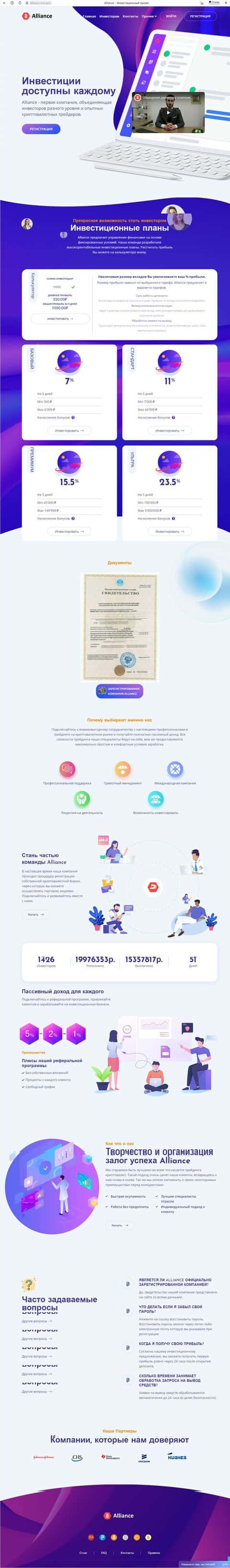 На мошеннический этот мутносайт не похож только что цветом, жулики Альянс ООО выбрали светлые оттенки. Но все остальное - типичные шулерские заманухи: обещания баснословных дивидендов, калькулятор для расчета супер-прибыли, и прочие бла-бла.