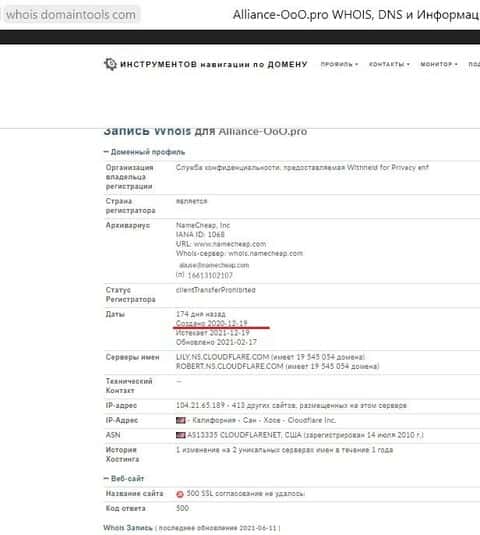 Но по версии сайта whois на момент написания статьи шулерскому сайту alliance-ooo pro всего лишь 174 дня! А значит, треп виртуального лже-директора о многолетнем существовании и опыте работы шарашки Альянс ООО - полная лажа.