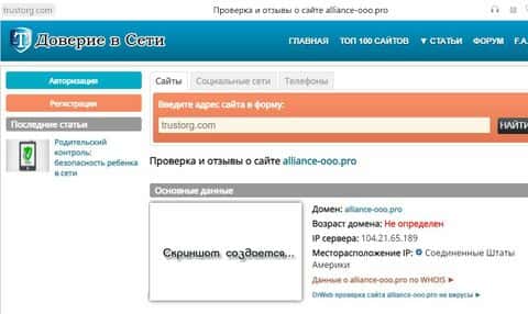 Сайт trustorg com не смог определить время создания лохоброкерского ресурса alliance-ooo pro. Здесь мошенники тоже ухитрились скрыть данные.