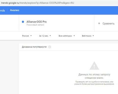 Так же выглядит ситуация по запросам в Google бреда "alliance-ooo pro". Система не может выявить динамику популярности из-за недостаточности данных.