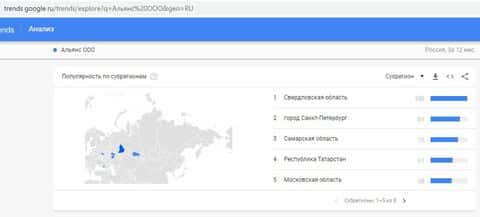 Согласно статистике, особый интерес к бренду "Альянс ООО" проявляют жители Свердловской области, города Санкт-Петербурга, Самарской области; чуть меньше - в республике Татарстан и Московской области.