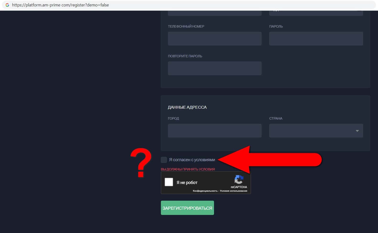 При регистрации в АМ Прайм требуется подтвердить согласие с клиентским соглашение фирмы, которого нет, так как ссылка не активна, и клиенты не знают условий сотрудничества.