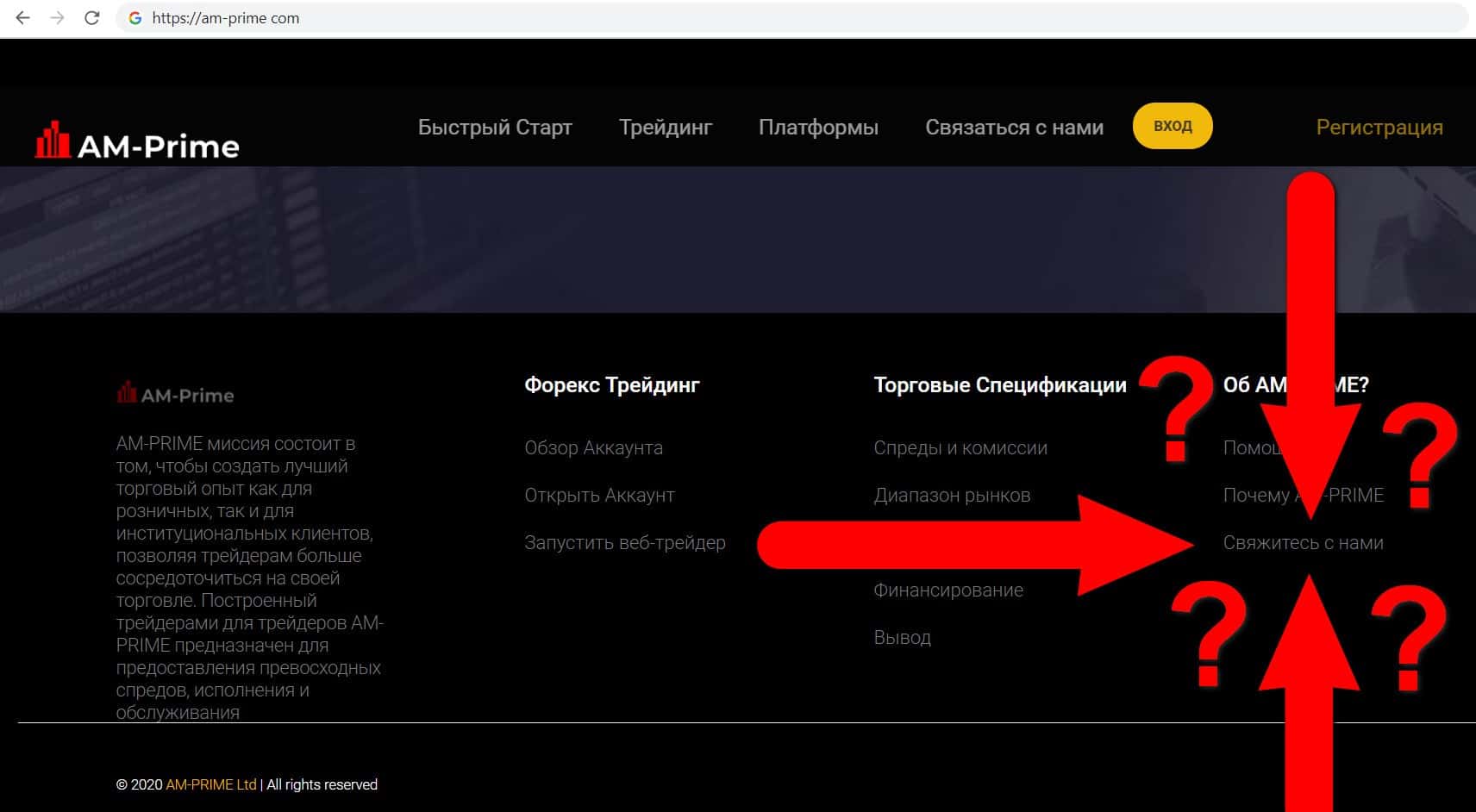 На своём сайте контора кидал АМ Прайм предоставила ссылку на свои контактные данные, но при нажатие на неё открывается главная страница сайта, и никаких контактов нет.