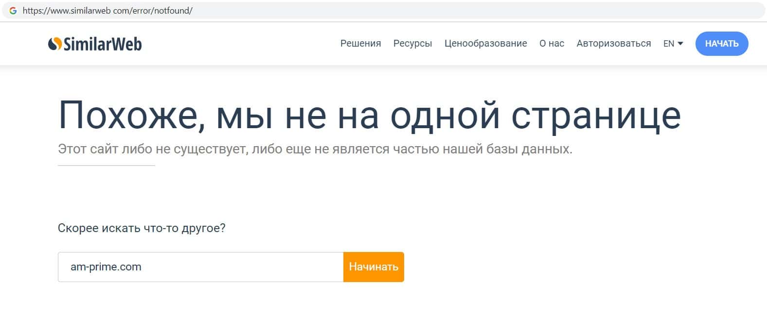Чтобы узнать трафик главного сайта АМ Прайм мы использовали интернет ресурс similarweb com. Оказалось, что международный сервис не обладает информацией о аферистах.