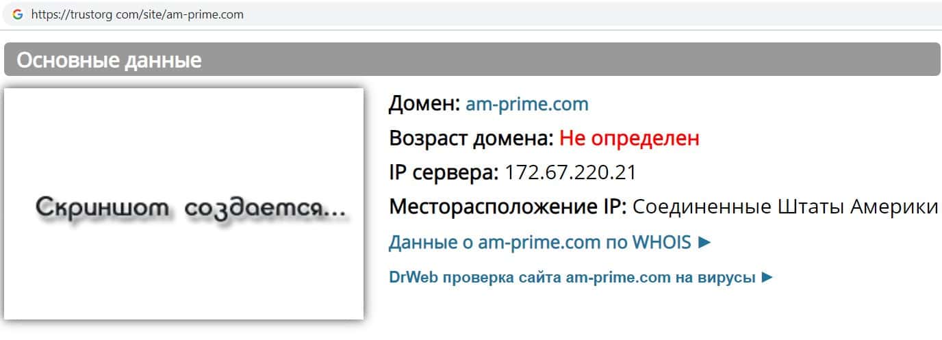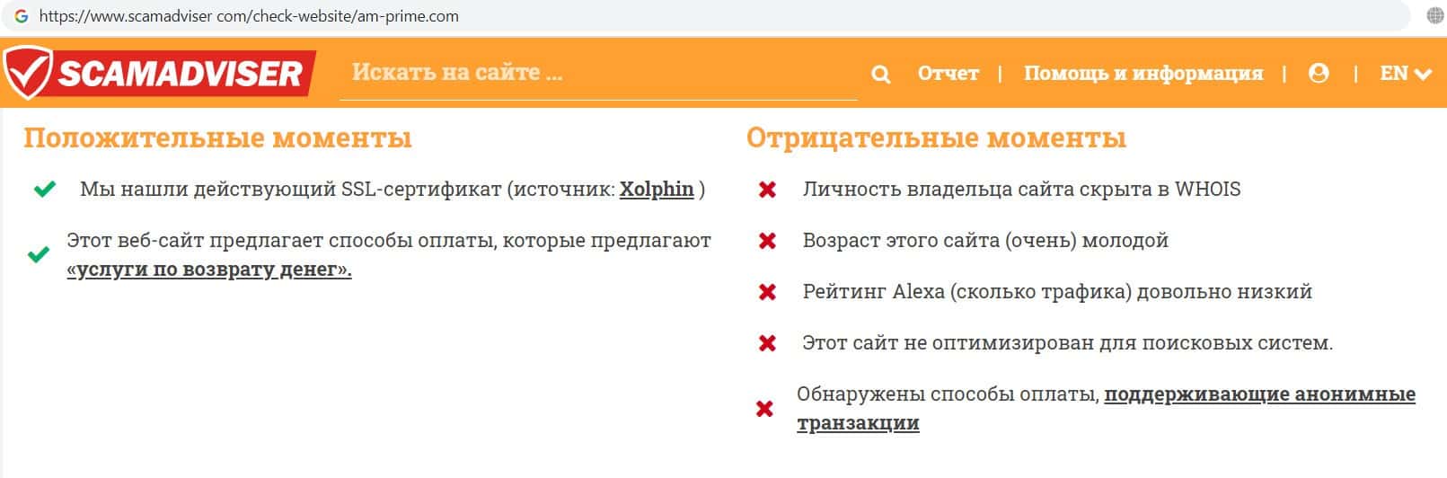 Мы проверили сайт АМ Прайм через интернет ресурс scamadviser com. Оказалось, что сайт кидал не оптимизирован для поисковых систем, а его владелец скрывает свою личность.
