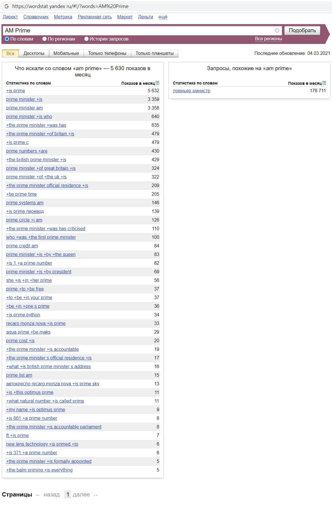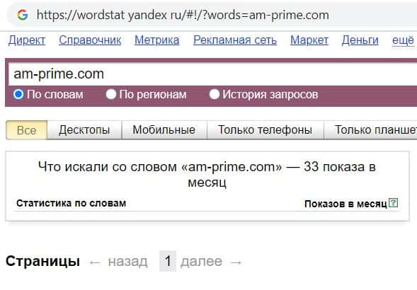 Проверили мы так же количество запросов недоконторы АМ Прайм по русскоязычному названию фирмы, но без пробела, а именно "АМПрайм", но и этот запрос никто не выполнял.