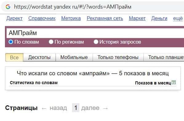 Ещё мы проверили количество запросов конторы АМ Прайм по русскоязычному названию фирмы, но без пробела, а именно "АМПрайм". 5 раз пользователи совершили этот запрос.