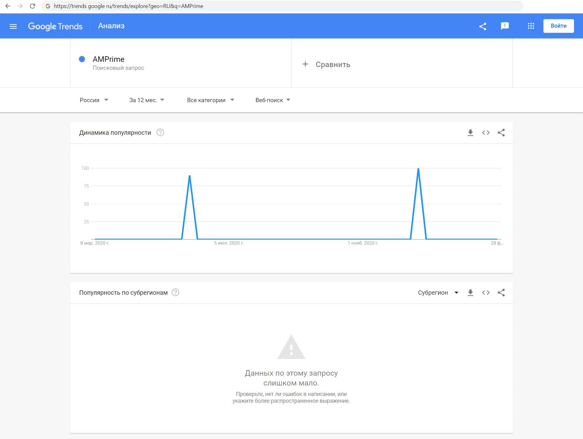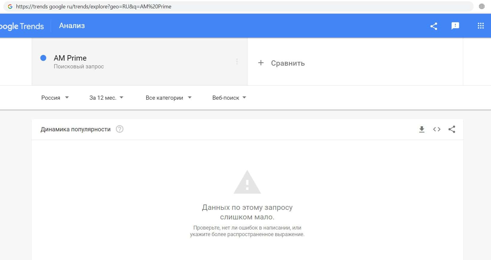 Мы проверили количество запросов лохотрона AM Prime в Google по названию конторы, а именно "AM Prime". Оказалось, что данный запрос никто из пользователей не выполнял.