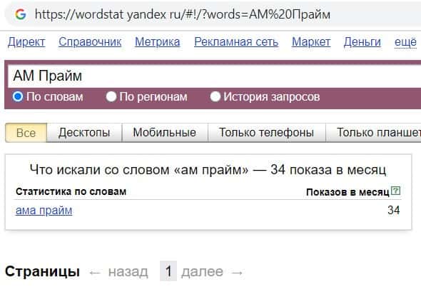 Так же мы проверили количество запросов конторы AM Prime по русскоязычному названию, а именно "АМ Прайм". 34 раза пользователи совершили данный запрос в течении месяца.