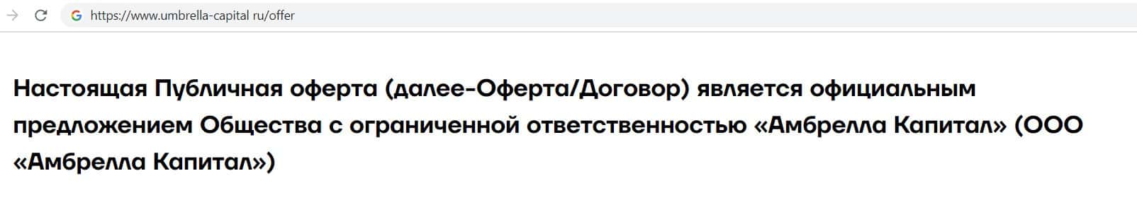 Контора кидал Umbrella-Capital Ru на своём главном сайте предоставила информацию о своём юридическом лице, которым является компания ООО «Амбрелла Капитал».