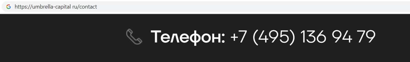 Контора мошенников Амбрелла Капитал на своём сайте указала номер телефона, с которого сотрудники лохотрона звонят клиентов и разводят их на деньги. Номер мошенников: