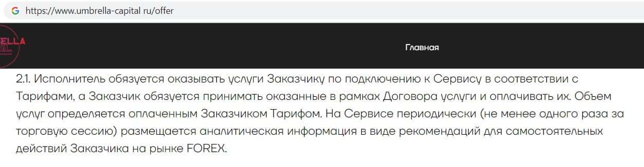 Компания Umbrella-Capital Ru в соглашении указала, что будет публиковать на своём сайте аналитическую информацию. Информация кидал может привести клиента к потере депозита.