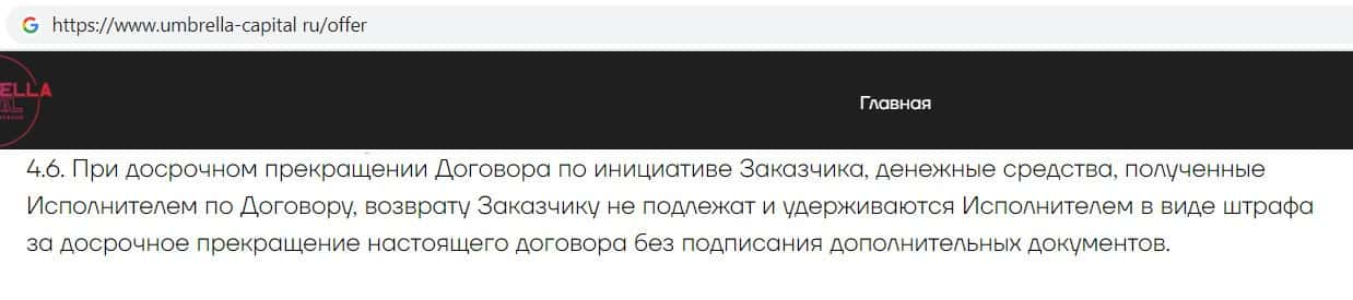 Компания Umbrella-Capital Ru указала, что если клиент решит прекратить сотрудничество с фирмой, то денежные средства ему не возвращаются, а используются в виде штрафа.