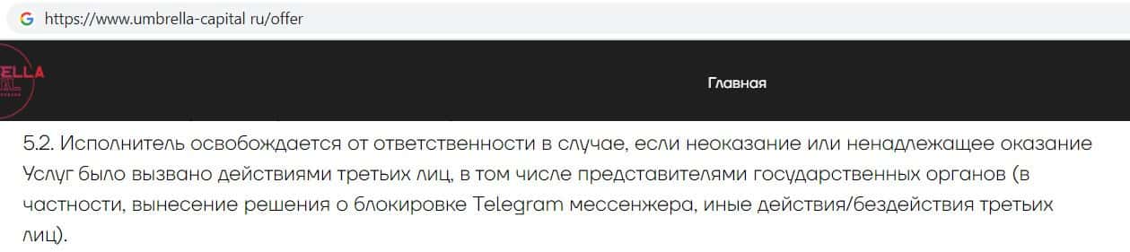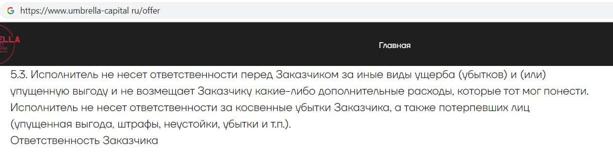 Ещё лохотрон Амбрелла Капитал указал в своём соглашении пункт, согласно которому освобождается от любой ответственности за прямые или косвенные денежные потери клиентов.