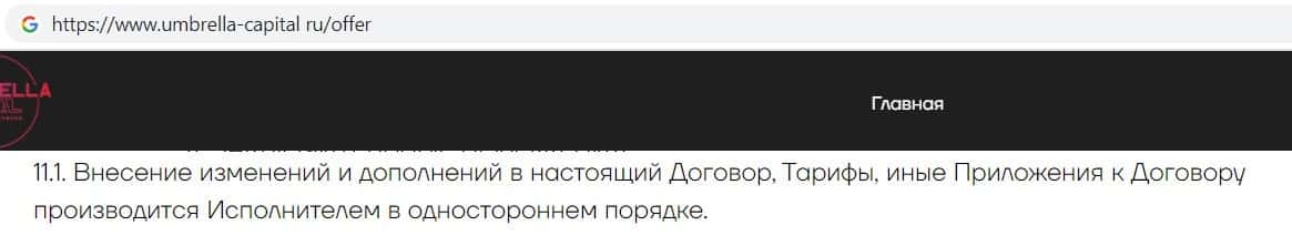 Ещё контора разводил Амбрелла Капитал указала, что в одностороннем порядке может вносить изменения в договор и в стоимость услуг своего финансового лохотрона.