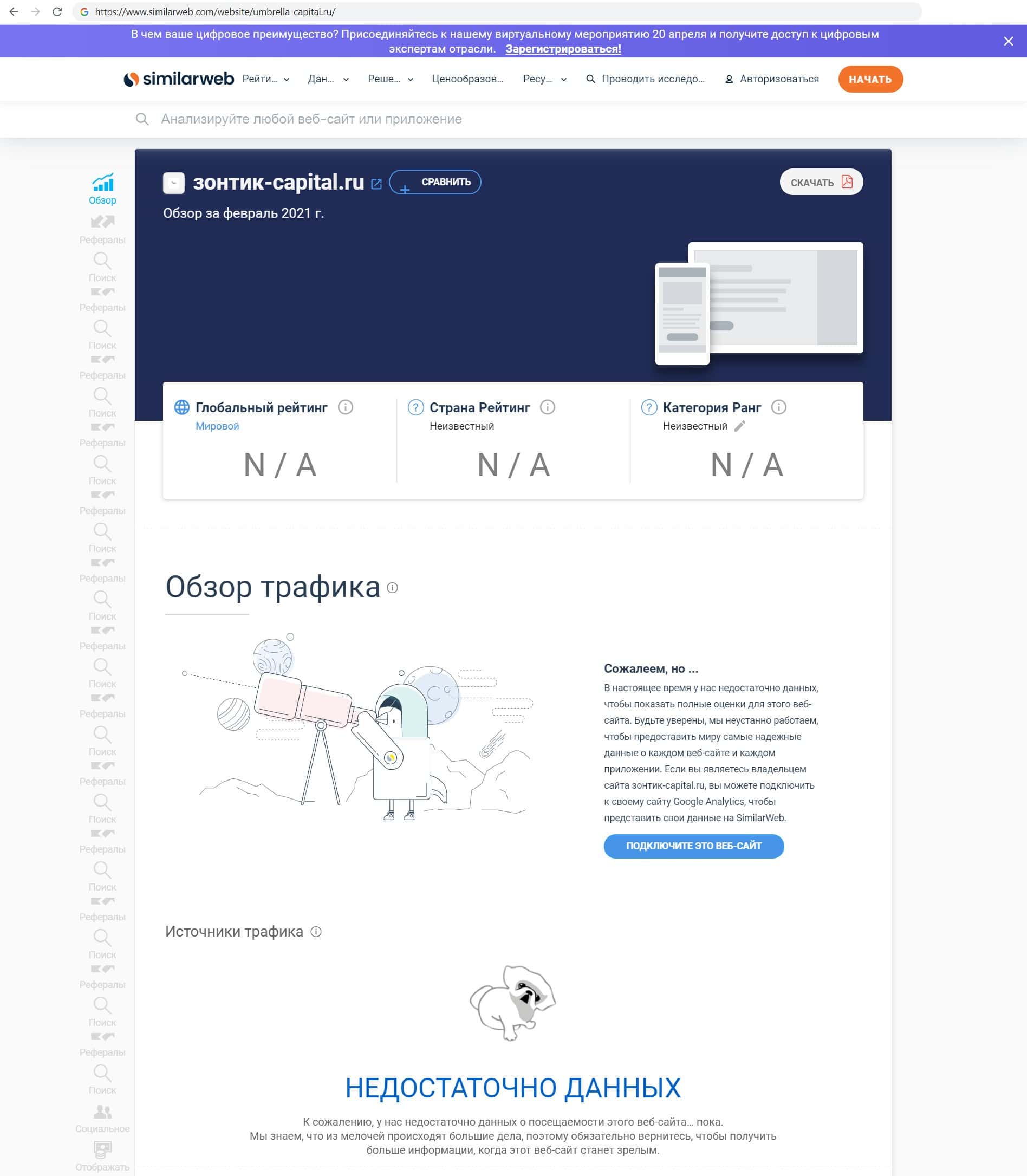 Мы использовали сайт similarweb com для того, чтобы узнать трафик сайта Umbrella-Capital Ru, но оказалось, что международный сервис не обладает информацией о кидалах.