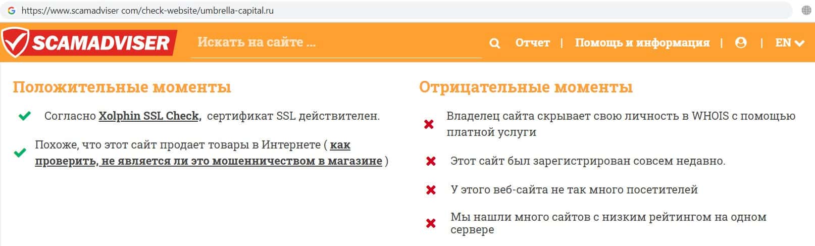 - Мнение интернет - ресурса scamadviser com о сайте кидал Амбрелла Капитал