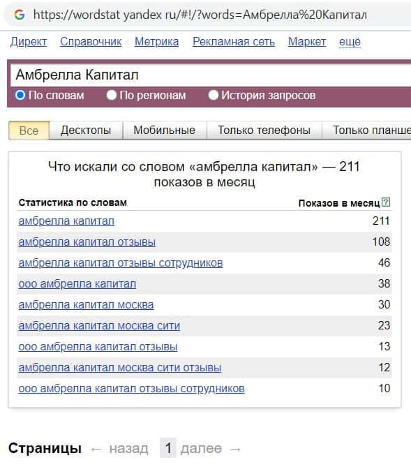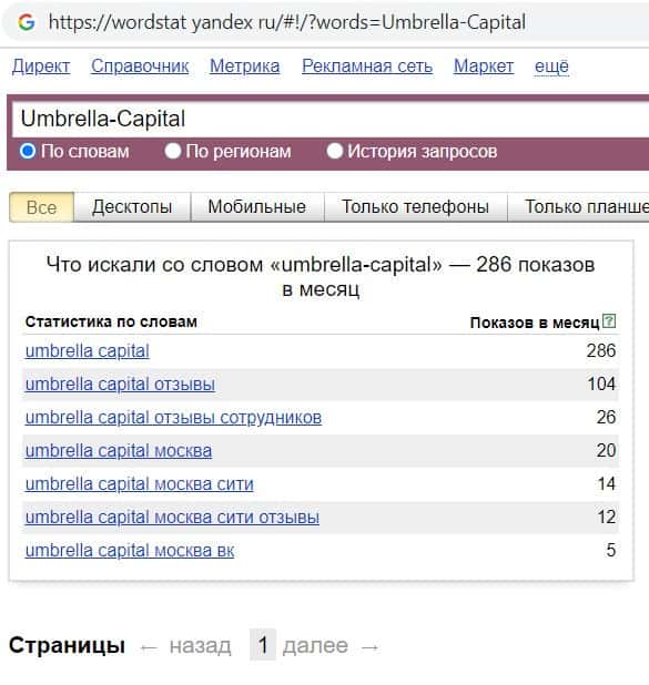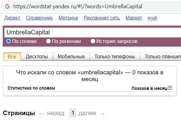 Мы так же проверили количество запросов недоконторы Umbrella-Capital Ru по названию фирмы, но без дефиса, а именно "UmbrellaCapital", но и этот запрос никто не выполнял.