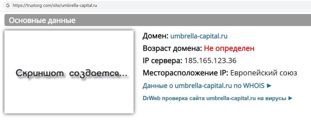 Информация о возрасте главного сайта мошенников Амбрелла Капитал