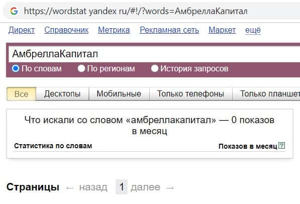 Мы ещё проверили количество запросов конторы махинаторов Umbrella-Capital Ru по русскоязычному названию, а именно "Амбрелла Капитал". Результат снова оказался нулевым.