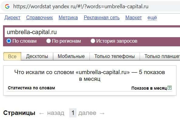 Проверили мы так же количество запросов фирмы Амбрелла Капитал по домену конторы с точкой, а именно "umbrella-capital.ru". Всего 5 раз пользователи совершили этот запрос.