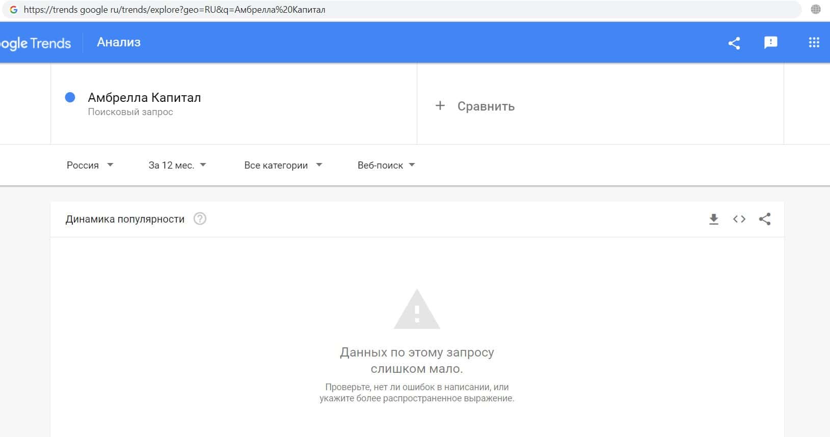 Ещё мы проверили количество запросов фирмы кидал Амбрелла Капитал по русскоязычному названию без пробела, а именно "АмбреллаКапитал", но результата нет.