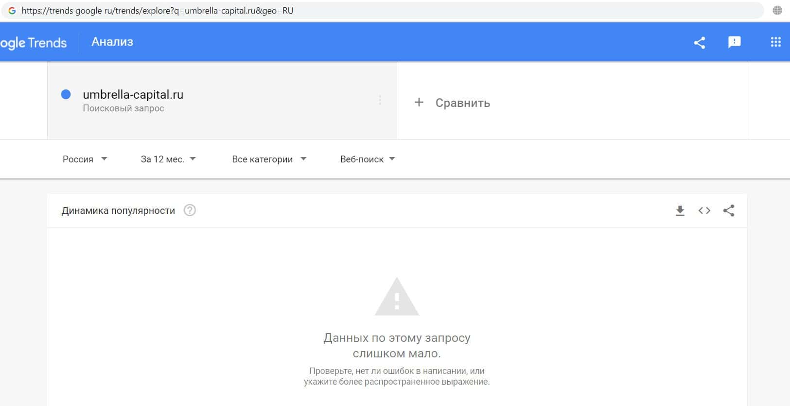 Напоследок мы проверили количество запросов конторы финансовых мошенников Амбрелла Капитал по домену с точкой, а именно "umbrella-capital.ru". Результата - нет.