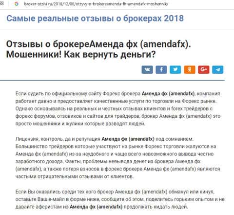 Сайт Аменда ФХ впечатляет - тут ребята постарались на славу. Уйма статей, разделов, подразделов - высокая информационная нагрузка призвана вызывать доверие у потенциальной жертвы. И это - единственная цель мошенников Аменда ФХ. Единственное, что вы получите от сотрудничества с этим брокером - пару статей. Ну, и внушительную партию разочарования.Аменда ФХ ведут активную деятельность в соцсетях