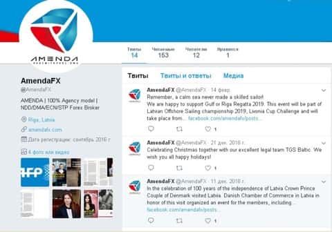 Лохотронщики из Аменда ФХ используют все возможные способы поиска потенциальных жертв. В том числе ведут страничку twitter com/amendafx. Правда, наблюдательные брокеры сразу заметят, что твиты выкладываются редко, а последние полгода на страничке вообще не было никакой активности.