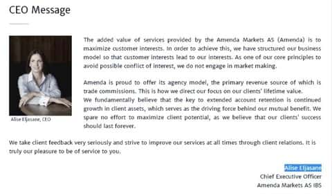 Нет толковой информации и о руководстве компании, кроме "послания", написанного от имени "директора" компании Alise Eljasane, в котором говорится о том, что главное для мошенников Аменда ФХ - забота об "интересах клиентов". Установить реальность ее личности невозможно.