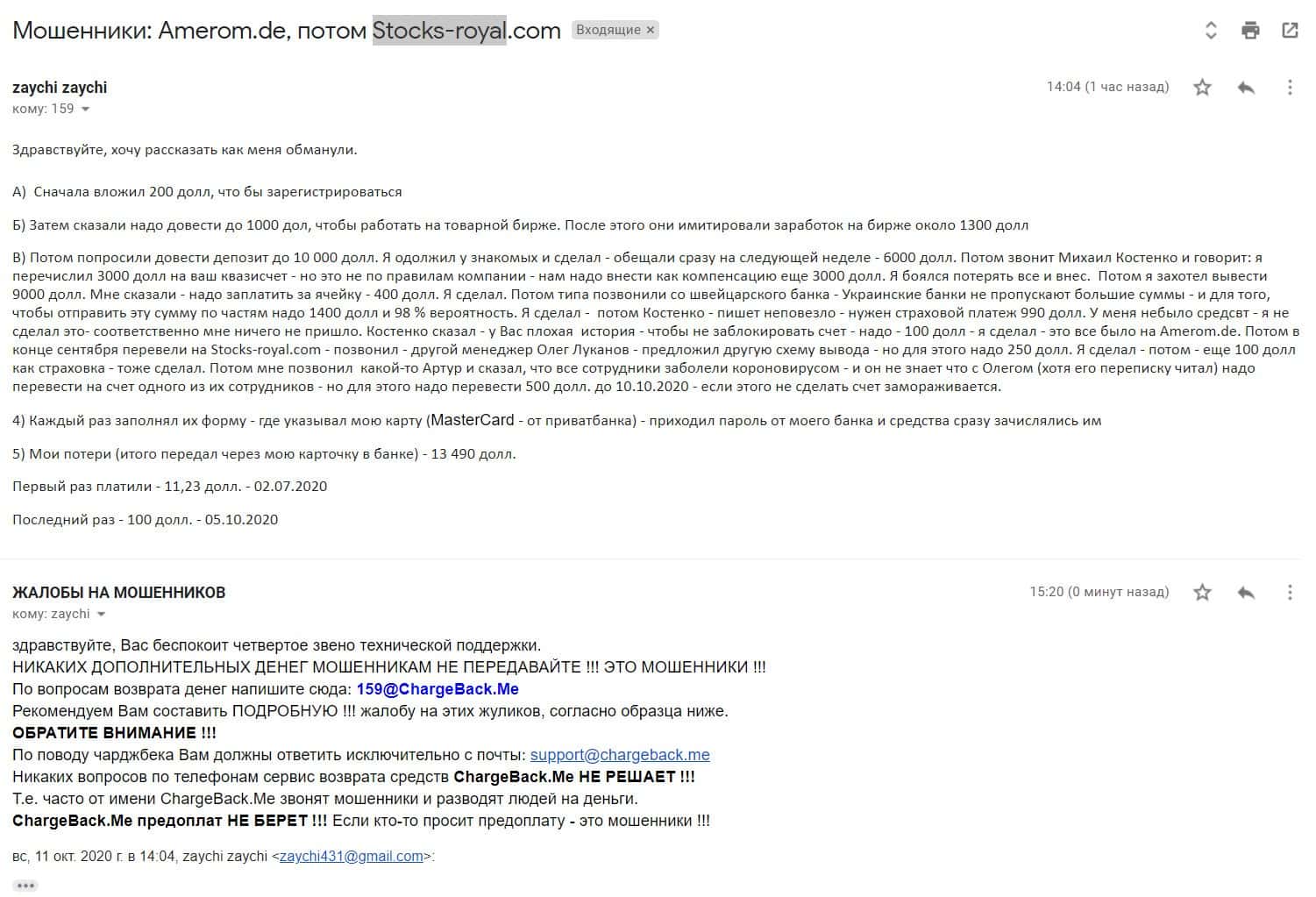 Ниже на скриншоте предлагаем ознакомится с жалобой на мошеннические форекс-компании АмеромДе и СтокРоялс, которые лишили человека суммы в размере около 13 500 долларов.
