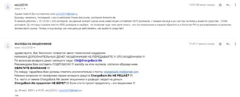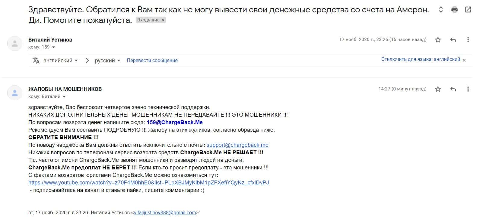 Далее предоставлена жалоба от одного из пострадавших, который сообщил, что аферисты Амером не вывели деньги со счета даже после оплаты налогов.