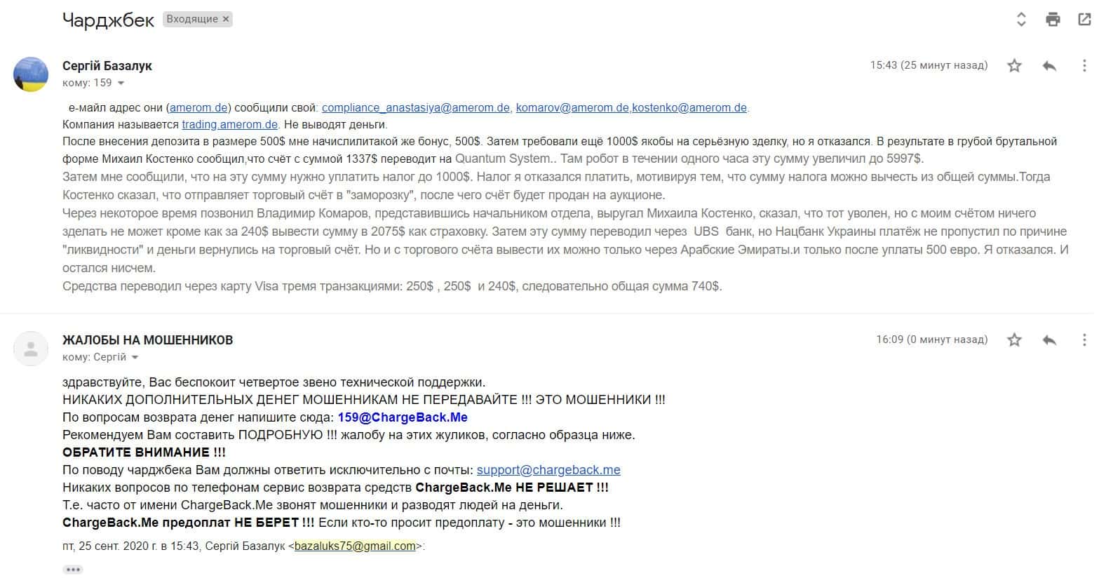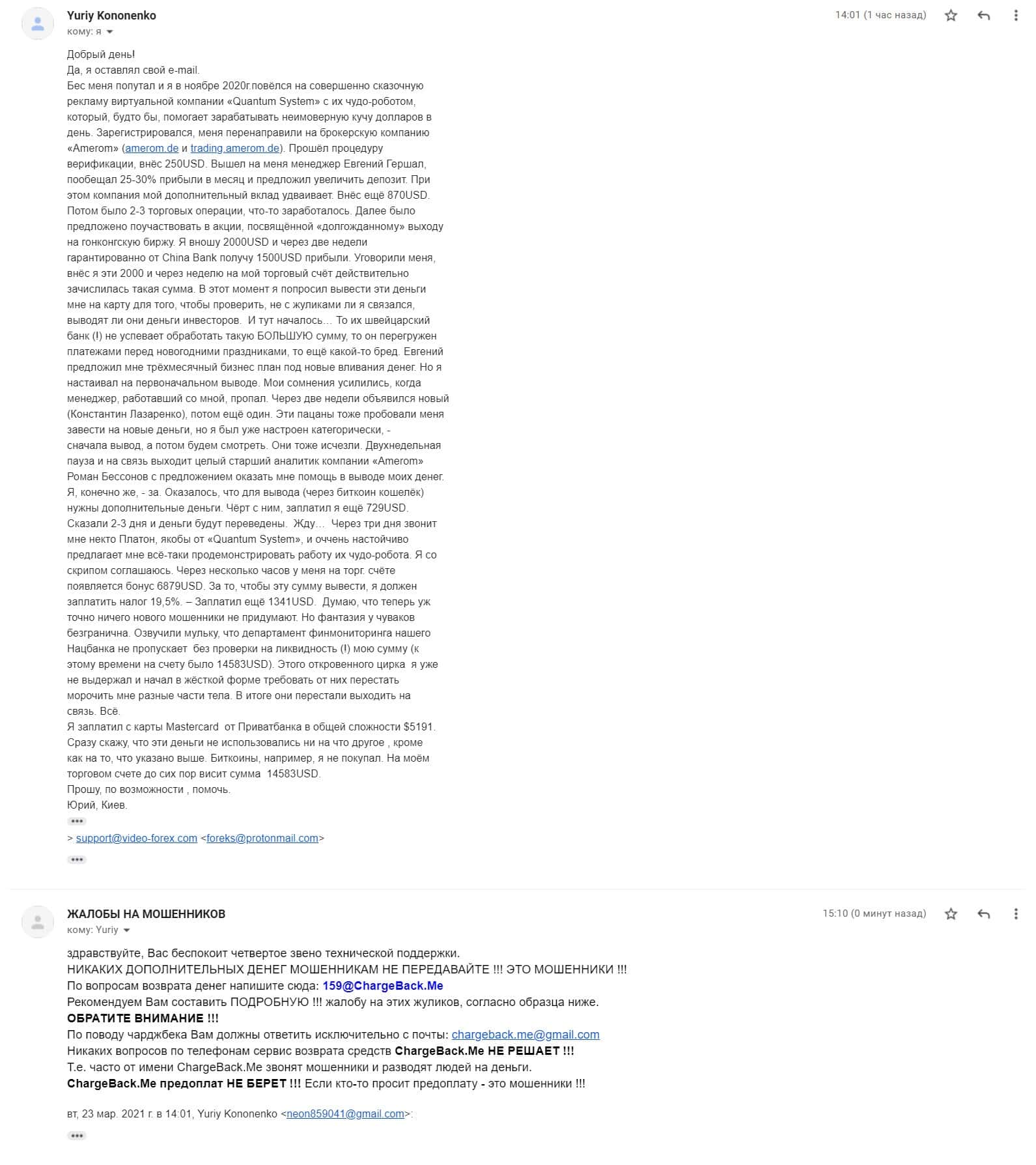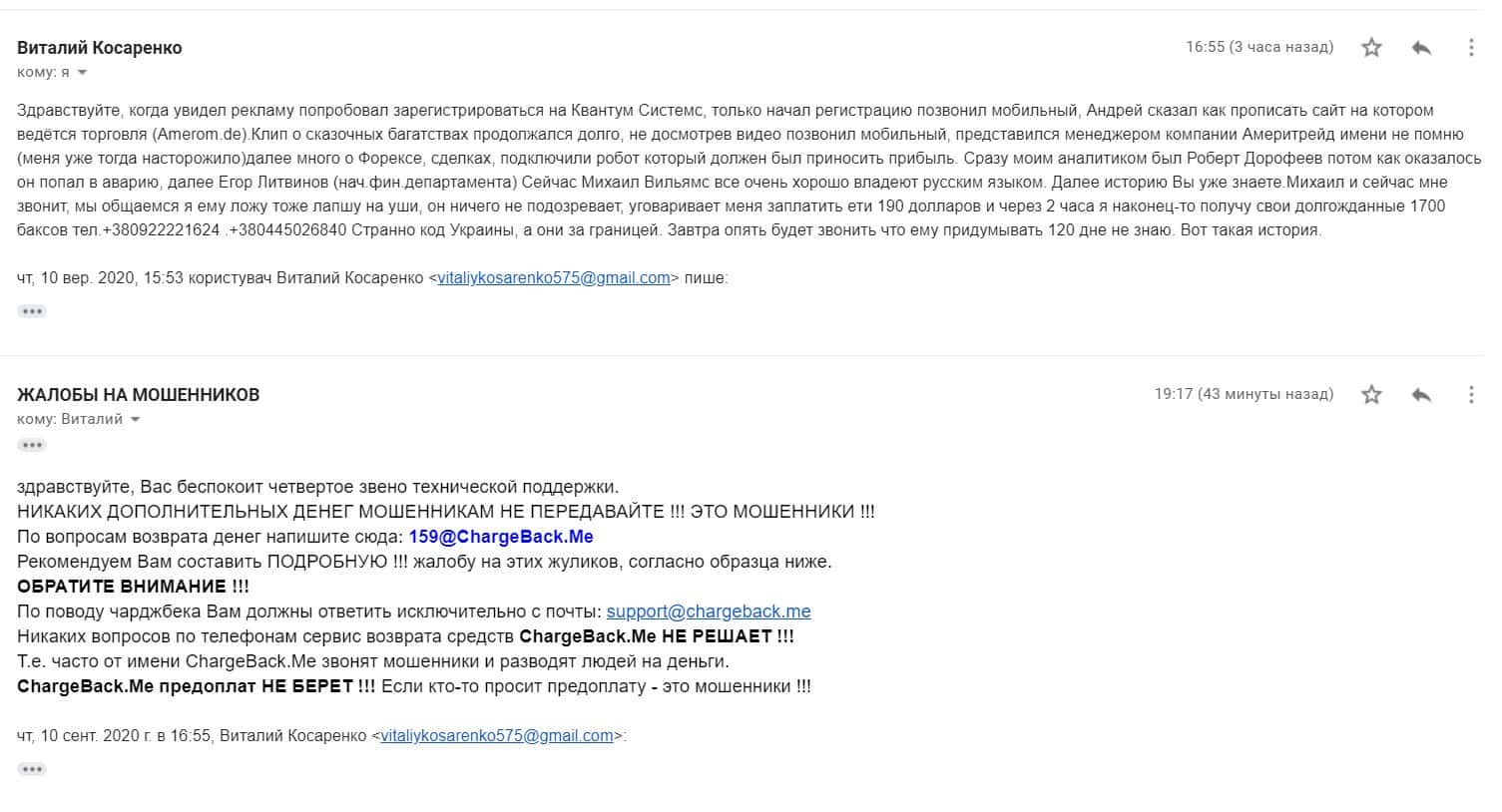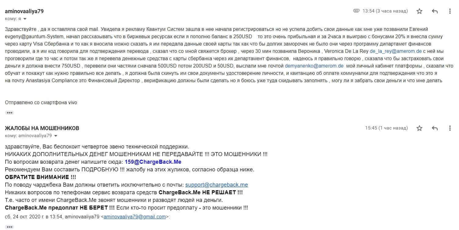 На скриншоте далее размещена жалоба на мошенническую брокерскую компанию Амером Де, а также на онлайн-аферистов Квантум Системс, которые совместно организовали развод в отношении автора данной информации.
