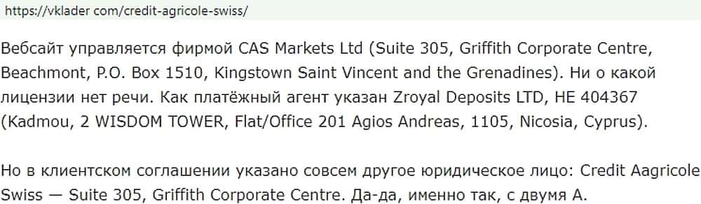 Также сомнительная конторка CAS Markets Ltd, совместно со своими подельниками ZRoyal Deposits Ltd, являются владельцами еще одного шараш-монтажа - кухней Credit Agricole Swiss.