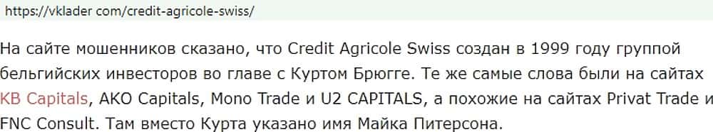 А сама форекс-афера Credit Agricole Swiss замечена в том, что имеет множество проектов-клонов своей кухни. Среди них KB Capitals, AKO Capitals, Mono Trade, u2capitals com и прочих.