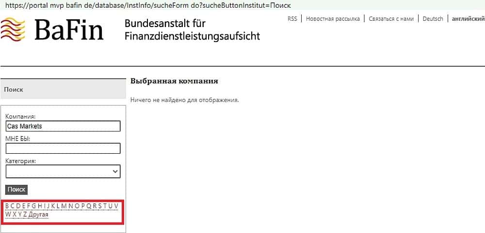 Конечно же это все лапша на уши. Достаточно обычной проверки, чтобы увидеть, что CAS Markets регулятору не известна, а компаний на букву "А" и вовсе нет в реестре этого органа.