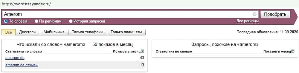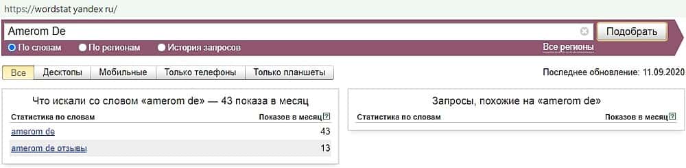 А вот вариант "Амером", хоть и показал довольно высокое количество запросов, но все они абсолютно не касаются лжеброкера. Так, что данный бренд не известен пользователям Яндекс.