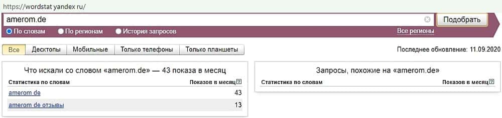Доменное имя жульнического сервиса "amerom.de" искало такое же количество людей, которые остановили свой выбор в пользу поисковика Яндекс Ру. Часть тоже искала отзывы.