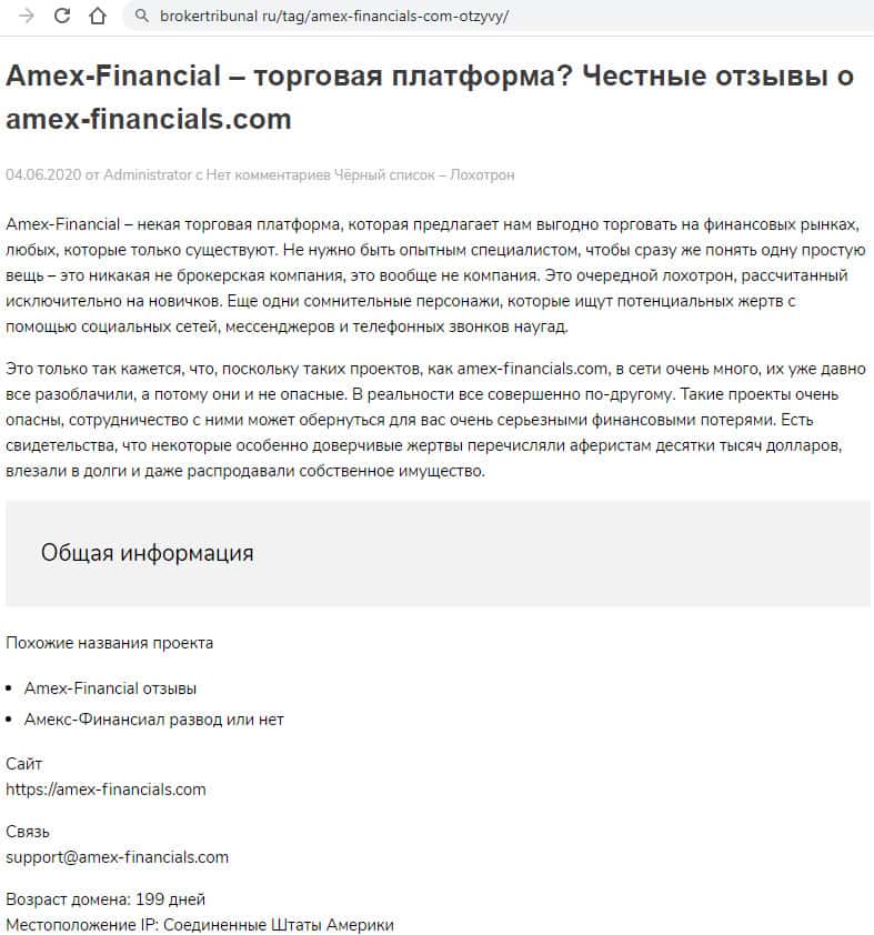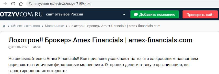 Еще одна площадка прямо говорит о том, что Amex Financials - это просто мошеннический проект - кухня, которая только и делает то, что разводит людей на деньги. Ничего более. Уже есть те, кто конкретно потерял тут свои кровные. И они не очень довольны тем, как эти мошенники ведут себя.