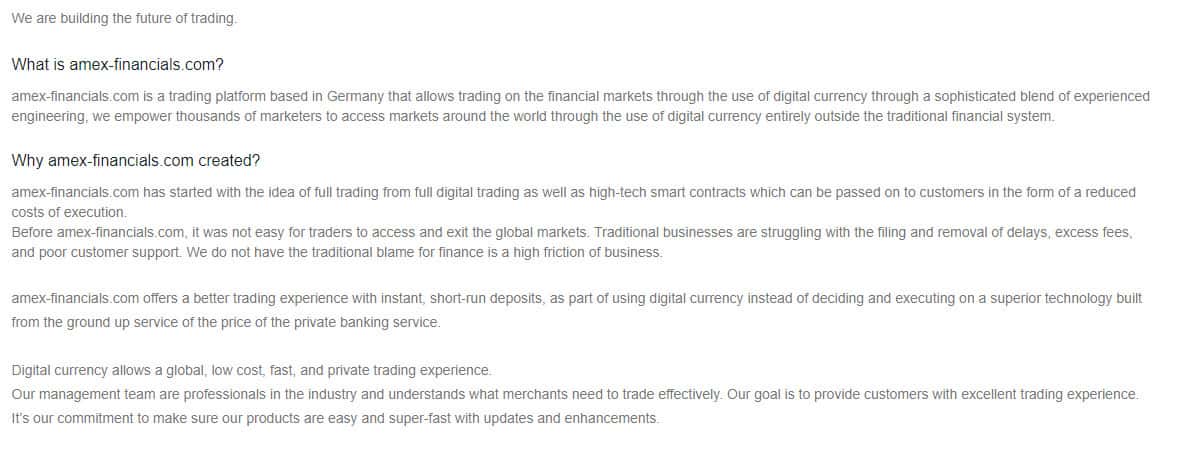 Это полный трешь, потому что это нормальным сайтом назвать нельзя. Мошенники Amex Financials сделали его за пару часов на какой-то фриланс площадке. Это первый момент. Второй состоит и том, что нет вообще никакой полезной информации для клиента. Это все, что нужно знать об этом мошенническом проекте и сделать вывод о том, что они жулики.