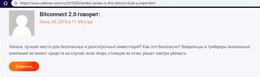 На изображении, расположенном ниже, вы можете наглядно увидеть и прочесть еще один негативный отзыв в сторону аферистов AMFEIX от пользователя сети интернет, в котором он не рекомендует иметь дело с жуликами Амфеикс, так как эта контора не предоставляет никаких гарантий и может слиться абсолютно в любой момент оставив наивную клиентуру без денег.