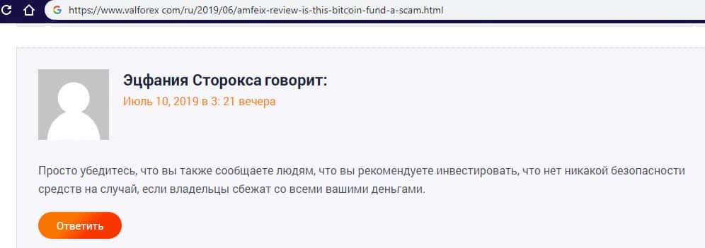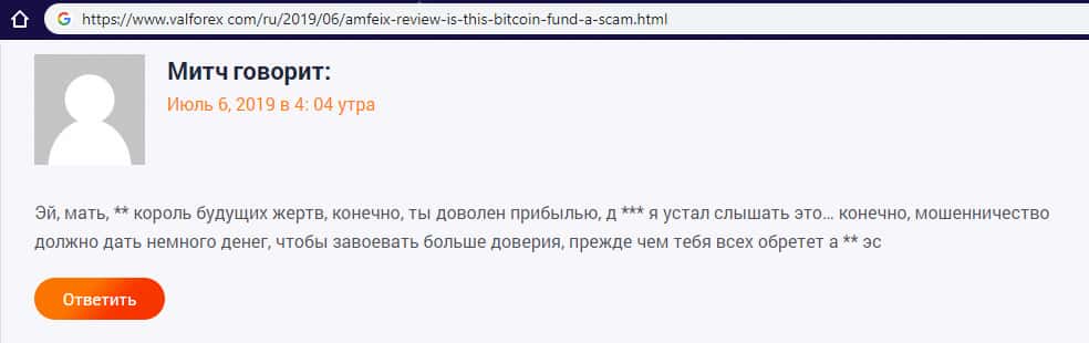 На изображении, расположенном ниже, вы можете наглядно увидеть негативный комментарий в сторону мошенников AMFEIX от очередного пользователя, который определенно не рекомендует иметь дело с данной конторой, так как это очередной развод на деньги, который создан банально и шаблонно, однако все же умудряется разводить пользователей на деньги.