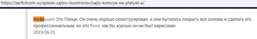 Ввиду мошеннической и противозаконной деятельности лохотрона Амфеикс на просторах сети интернет очередной пользователь не рекомендует иметь дело с аферистами AMFEIX, так как данная контора была создана исключительно для развода клиентов под предлогом довольно сомнительных инвестиций. На изображении ниже вы можете увидеть отзыв о жулье Амфеикс.