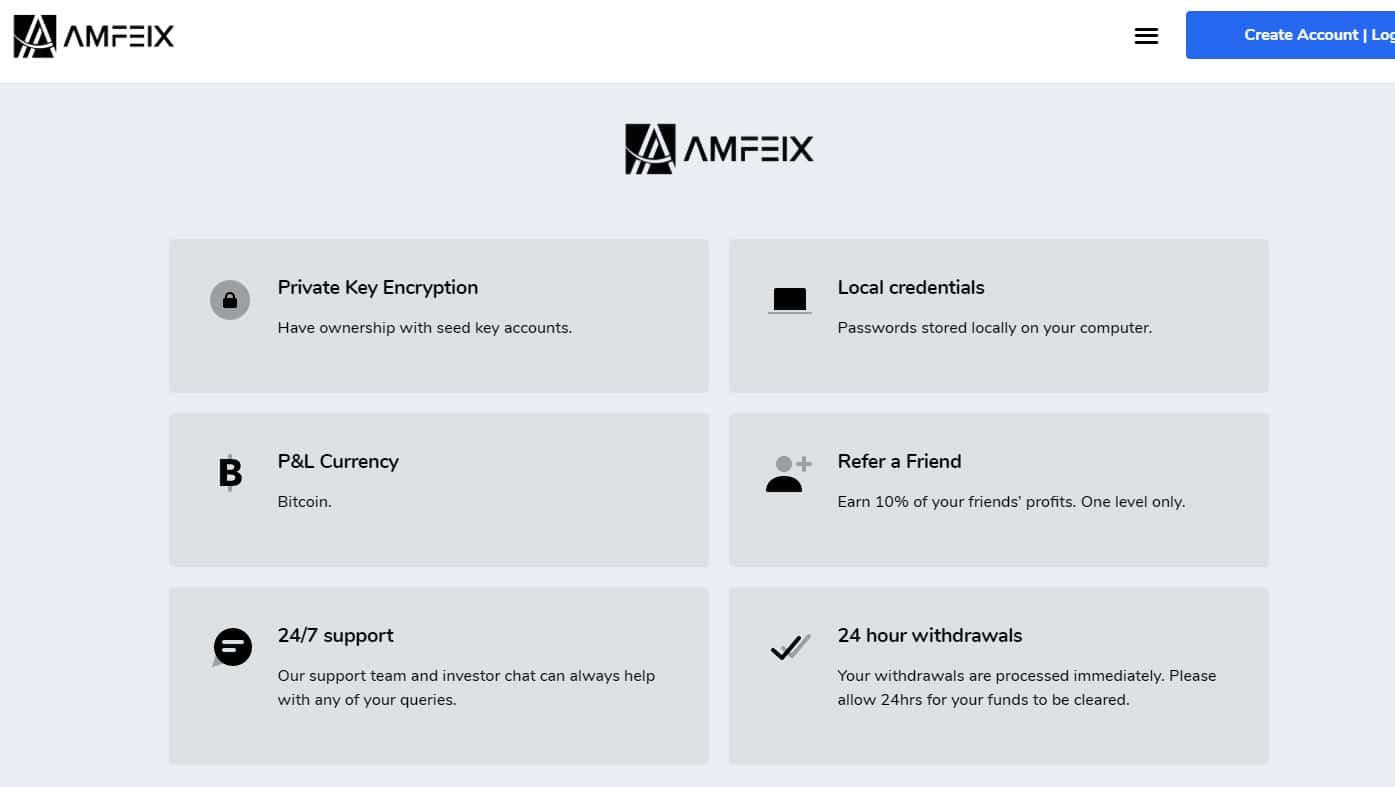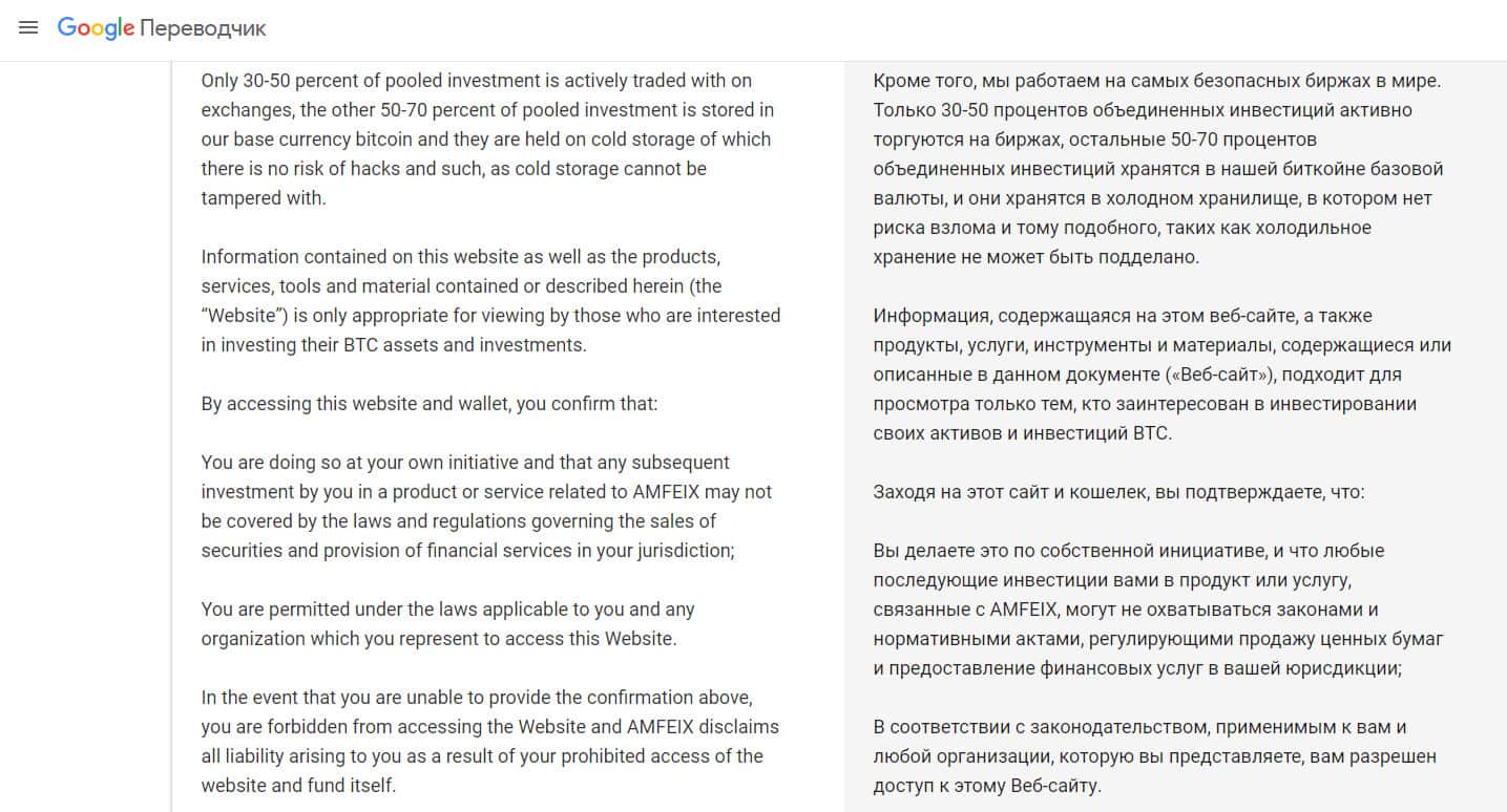 - Условий сотрудничества или же политики конфиденциальности жулики AMFEIX не предоставляют