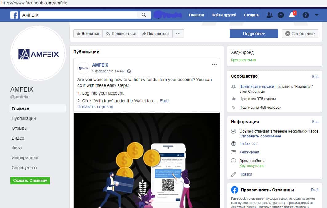 Дабы соответствовать современным трендам шулера Амфеикс обзавелись страницами в социальных сетях одной из которых является Facebook, где у мошенников AMFEIX имеется всего несколько сотен подписчиков. На изображении, расположенном ниже, вы можете наглядно увидеть непосредственно внешний вид страницы проходимцев Амфеикс в социальной сети Фейсбук.