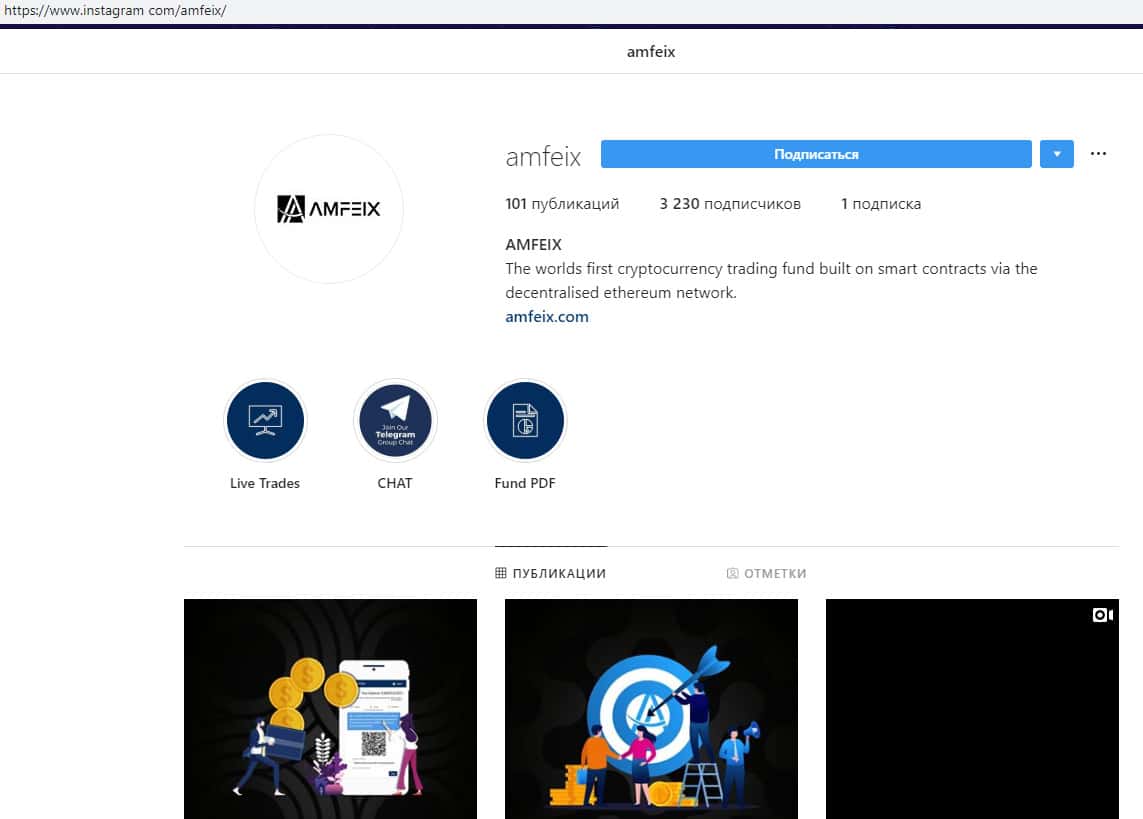 Имеется у мошенников AMFEIX и страница в социальной сети Instagram, где у шулеров Амфеикс имеется несколько тысяч подписчиков, что говорит о халтуре шулеров AMFEIX, которые создали данную страницу отчасти для виду и толком не продвигают ее. На изображении, расположенном ниже, вы можете увидеть страницу жулья в социальной сети Инстаграм.
