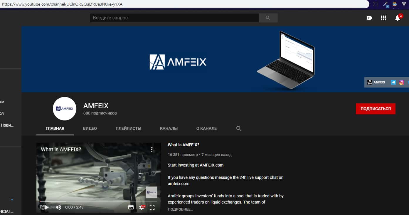 Для размещения различных мотивационных видеороликов с лапшой на уши наивной клиентуре аферисты AMFEIX обзавелись страницей в социальной сети YouTube, где у мошенников Амфеикс имеется менее тысячи подписчиков. На изображении, расположенном ниже, вы можете наглядно увидеть страницу аферистов AMFEIX с Ютубе.