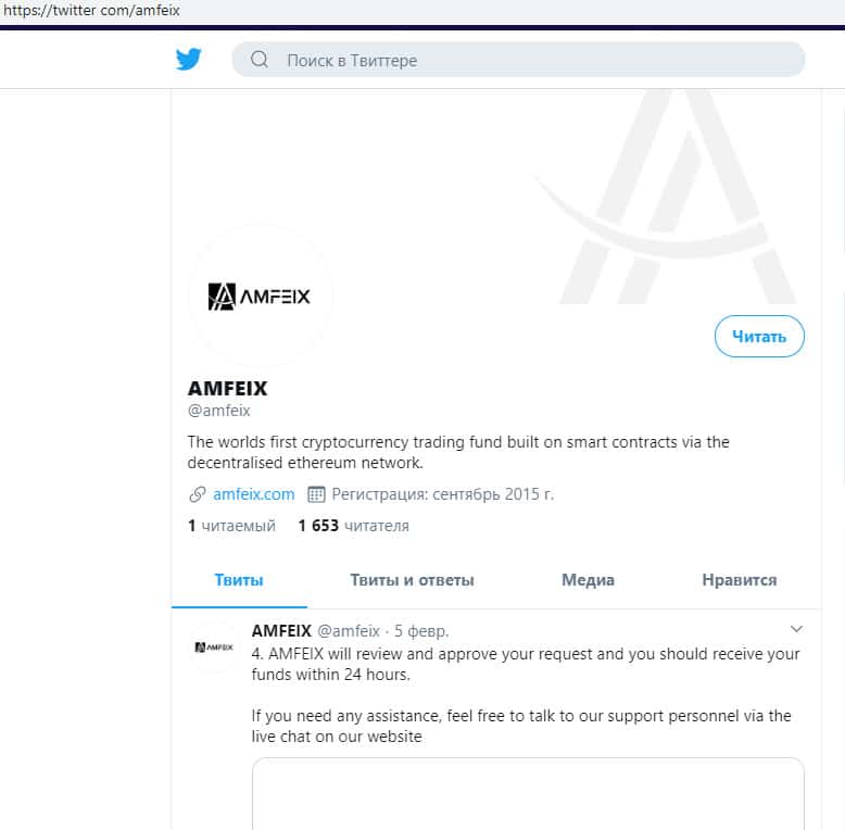 Имеется у проходимцев Амфеикс и страница в социальной сети Твиттер, где у мошенников AMFEIX около полторы тысячи подписчиков, что говорит о крайне низкой популярности аферистов Амфеикс, или же их нежелании иметь дело с наивными пользователями. На изображении ниже вы можете наглядно увидеть страницу проходимцев AMFEIX в Twitter.