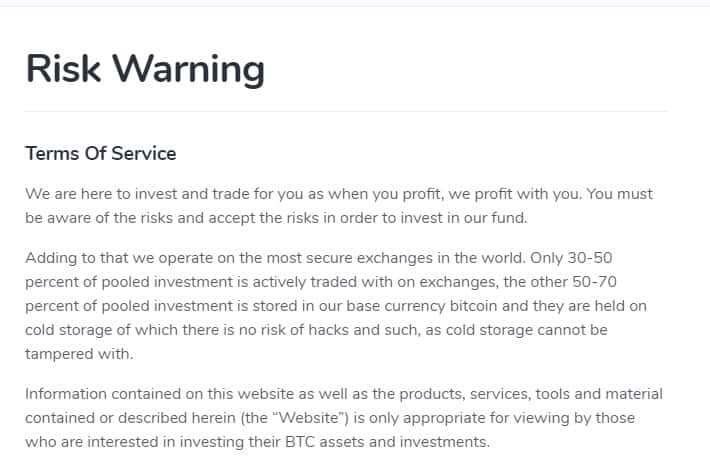 Ввиду своей подвальности и халтурности аферисты Амфеикс не предоставляют никаких условий сотрудничества или же политики конфиденциальности. Вместо этого у лохотрона AMFEIX имеется предупреждение о рисках, в котором лохотрон Амфеикс отказывается от ответственности за потери наивных пользователей, что вы можете увидеть на изображении ниже.