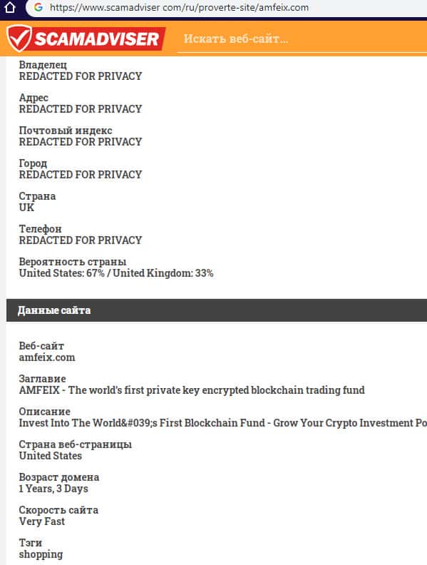В связи с мошеннической и противозаконной деятельностью лохотрона Амфеикс его реальные руководители предпочитают анонимность дабы избежать ответственности со стороны правоохранительных органов. Техническую же информацию о сайте жулья AMFEIX можно узнать с помощью портала scamadviser com, что вы можете наглядно увидеть ниже.